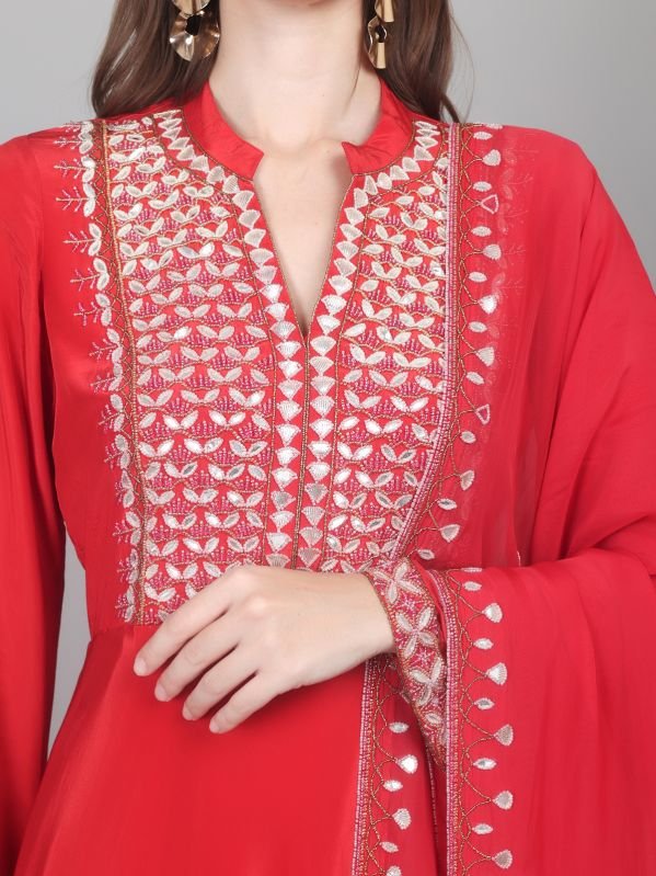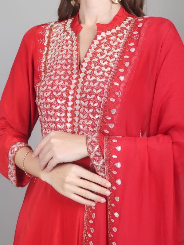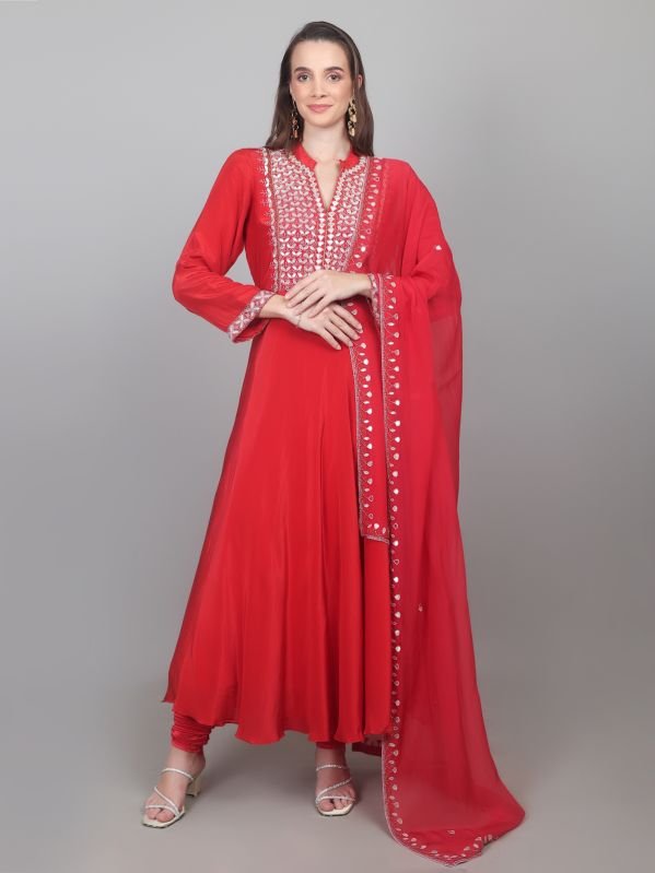 A Churidar sets for women typically includes a churidar (a type of tight-fitting pant) and a Kameez (a long tunic), often paired with a dupatta. Churidars are characterized by their sung fit, with extra fabric gathering at the ankles, esembling a stack of bangles, hence the name "churidar" (Churi meaning bangles). The kameez can vary in length and style, and the dupatta adds an element of grace and can be draped in various ways Churidar sets are popular for their comfort, versatility, and elegant silhouette, making them suitable for both casual and formal wear. They are a staple in Indian fashion and are worn by women across different regions and cultures.